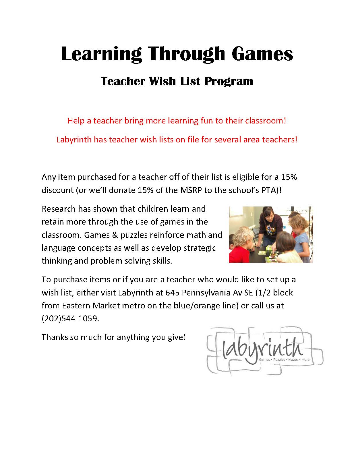 Did you know Labyrinth Game Shop has a Teacher Wish List program? Tell your teachers they can bring more learning fun into their classroom at a discount. See details here.