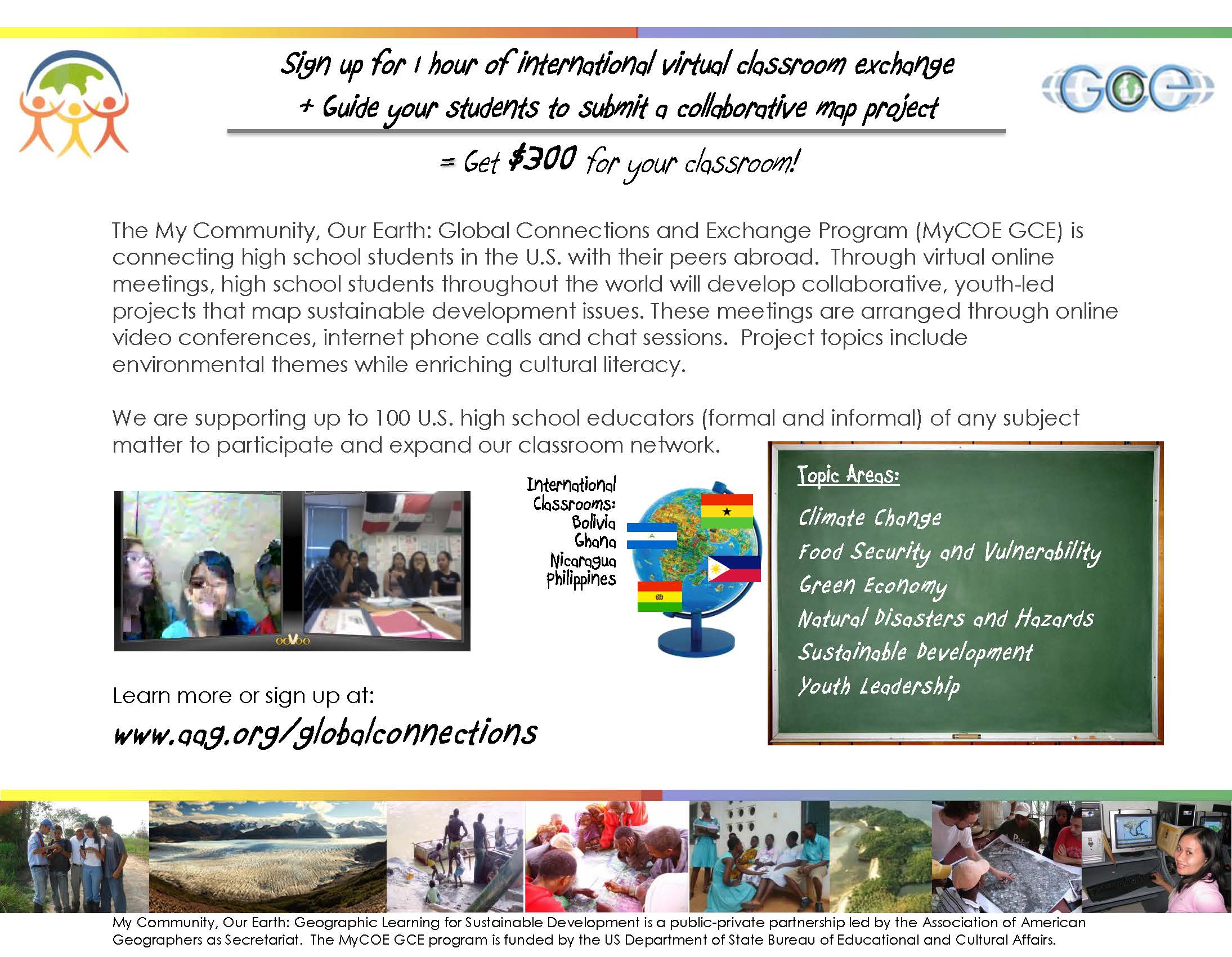 The Association of American Geographers has a program called MyCOE Global Connections & Exchange. The focus is on sustainable development (e.g., climate change, food security) and raising awareness in our local communities via collaborative mapping. The program is open to high school students and teachers can earn $300 for their classroom. See more details here and visit: http://www.aag.org/globalconnections.