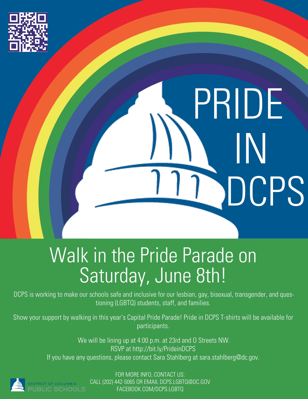 Why: DCPS is working to make our schools safe and inclusive for our lesbian, gay, bisexual, transgender, and questioning (LGBTQ) students, staff, and families. Let’s show our support by walking in this year’s Capital Pride Parade!