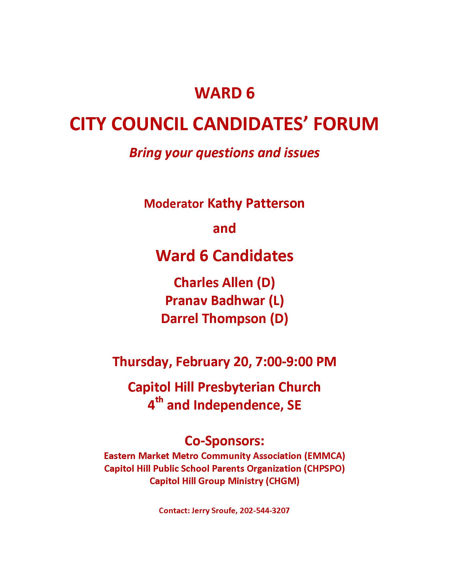 2 thoughts on “Ward 6 Council Candidates Forum on Thurs, Feb 20, 7-9PM”