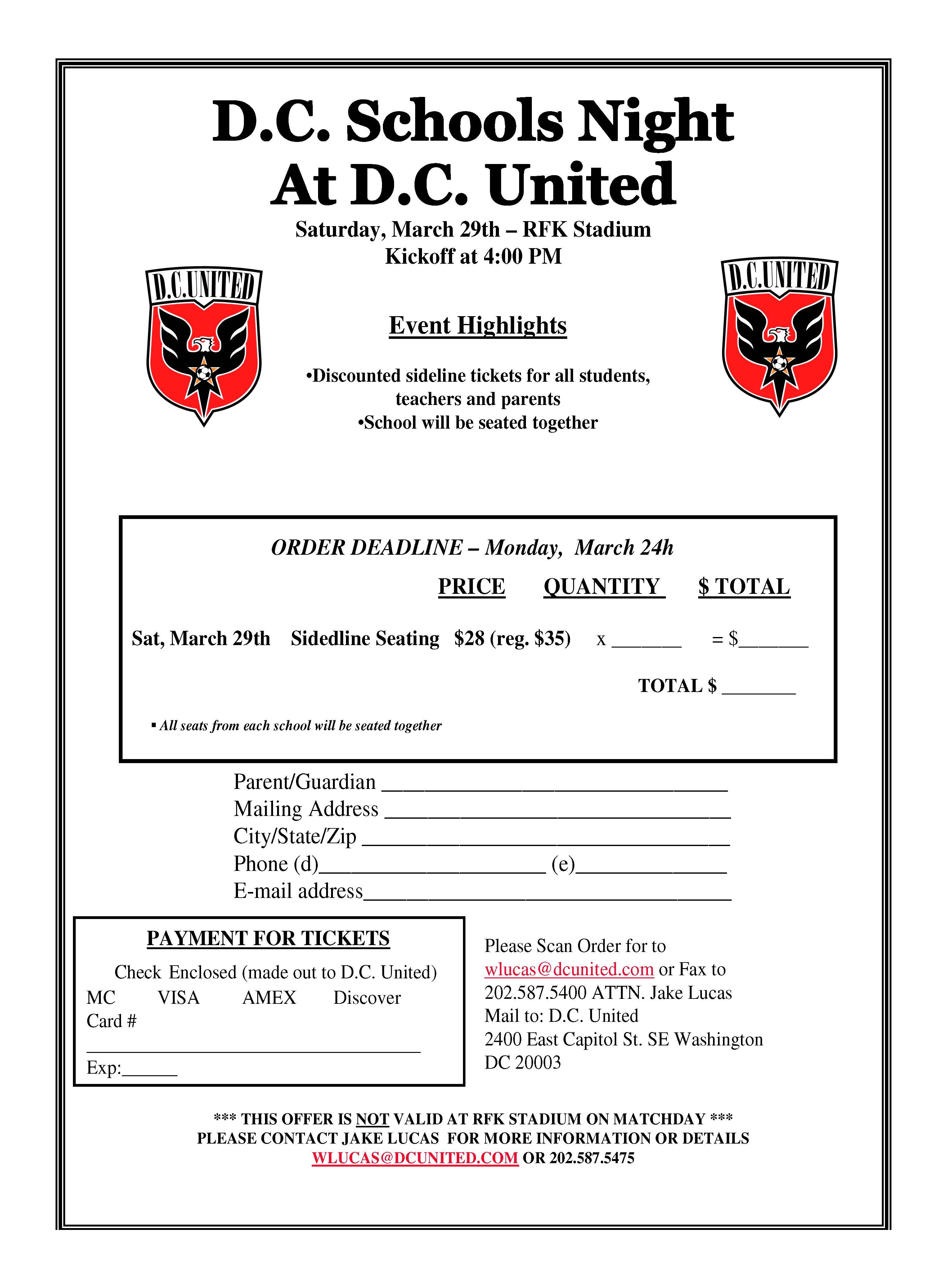 DC Schools Night at DC United is Saturday, March 29 Posted bySandraMarch 13, 2014Posted inCapitol Hill Events, Community EventsTags:community events, dc united, Events Discounted tickets for students, school staff and parents. Contact Jake Lucas (WLUCAS at DCUNITED dot com) for details. Share this:Share Click to share on Facebook (Opens in new window) Facebook Click to share on X (Opens in new window) X Click to email a link to a friend (Opens in new window) Email Click to share on Reddit (Opens in new window) Reddit Click to print (Opens in new window) Print Like Loading... Related