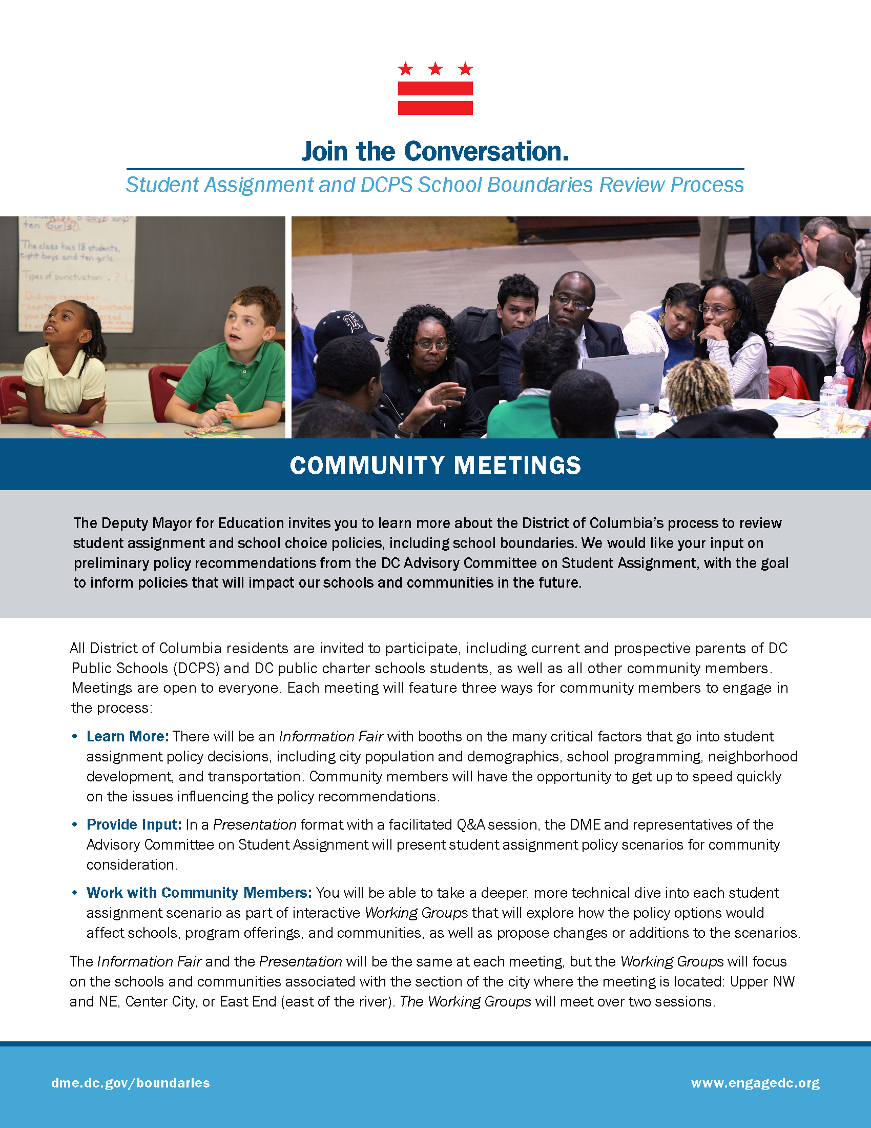DME Boundary Review Open House Dates and Locations Posted bySandraApril 2, 2014April 24, 2014Posted inCommunity Events, DCPS, DMETags:boundary review, deputy mayor of education, DME, feeder patterns Share this:Share Share on Facebook (Opens in new window) Facebook Share on X (Opens in new window) X Email a link to a friend (Opens in new window) Email Share on Reddit (Opens in new window) Reddit Print (Opens in new window) Print Like Loading... Related