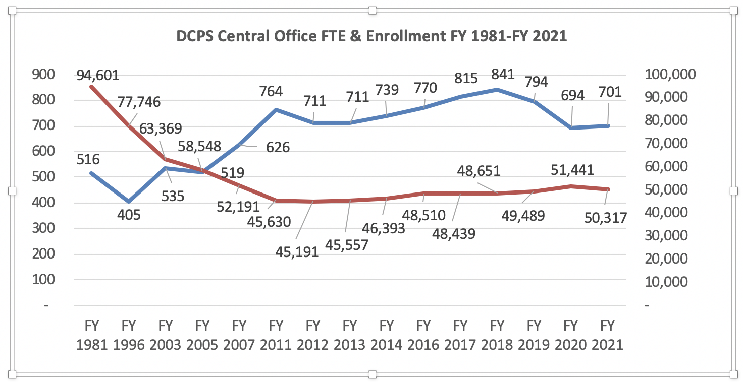 For many years I have categorized DCPS employees by a consistent set of definitions based on whether or not they serve students directly, which is what most of the public want to know when they ask about central office or “administration.”1 The number of central office employees has decreased a little recently, but is still much higher than in years much earlier when enrollment was much higher. Surely some of that cost could go to services in the schools. The number of central office full-time equivalent staff performing the same functions that DCPS now performs rose from 516 in 1981, when we had 95,000 students to 626 in 2007, when we had 52,000, and as of last month to 705 for 50,000. They include 4 Executive Directors, 9 Chiefs, 24 Deputy Chiefs, 75 Directors, 165 Managers and 41 Analysts. The system needs some number of these officials, and those who are good are worth a great deal. But do we really need 35 Executive Directors, Chiefs and Deputy Chiefs? 165 Managers?