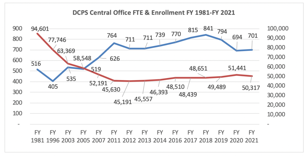 Finally, as of mid-March, 2021, we do not know the Final Initial Allocations to schools, nor how much money DCPS will have in total. The amount in central accounts will be announced only when the Mayor releases her proposed budget in late April. For many years I have categorized DCPS employees by a consistent set of definitions based on whether or not they serve students directly, which is what most of the public want to know when they ask about central office or “administration.”[1] The number of central office employees has decreased a little recently but is still much higher than in years much earlier when enrollment was much higher. The number of central office full-time equivalent staff performing the same functions that DCPS now performs rose from 516 in 1981, when we had 95,000 students to 626 in 2007, when we had 52,000, and as of last month to 701 for 50,000. They include 4 Executive Directors, 9 Chiefs, 24 Deputy Chiefs, 75 Directors, 165 Managers and 41 Analysts. The system needs some number of these officials, and those who are good are worth a great deal. But do we really need 35 Executive Directors, Chiefs and Deputy Chiefs? 75 Directors? 165 Managers? Could some of these positions not be redirected to retain local school staff?
