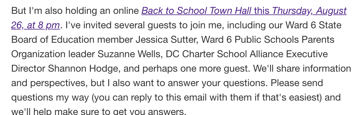 Ward 6 Schools community, please join Ward 6 Councilmember Allen’s Back to School Town Hall on Thursday, August 26 at 8PM via Zoom. Register here.