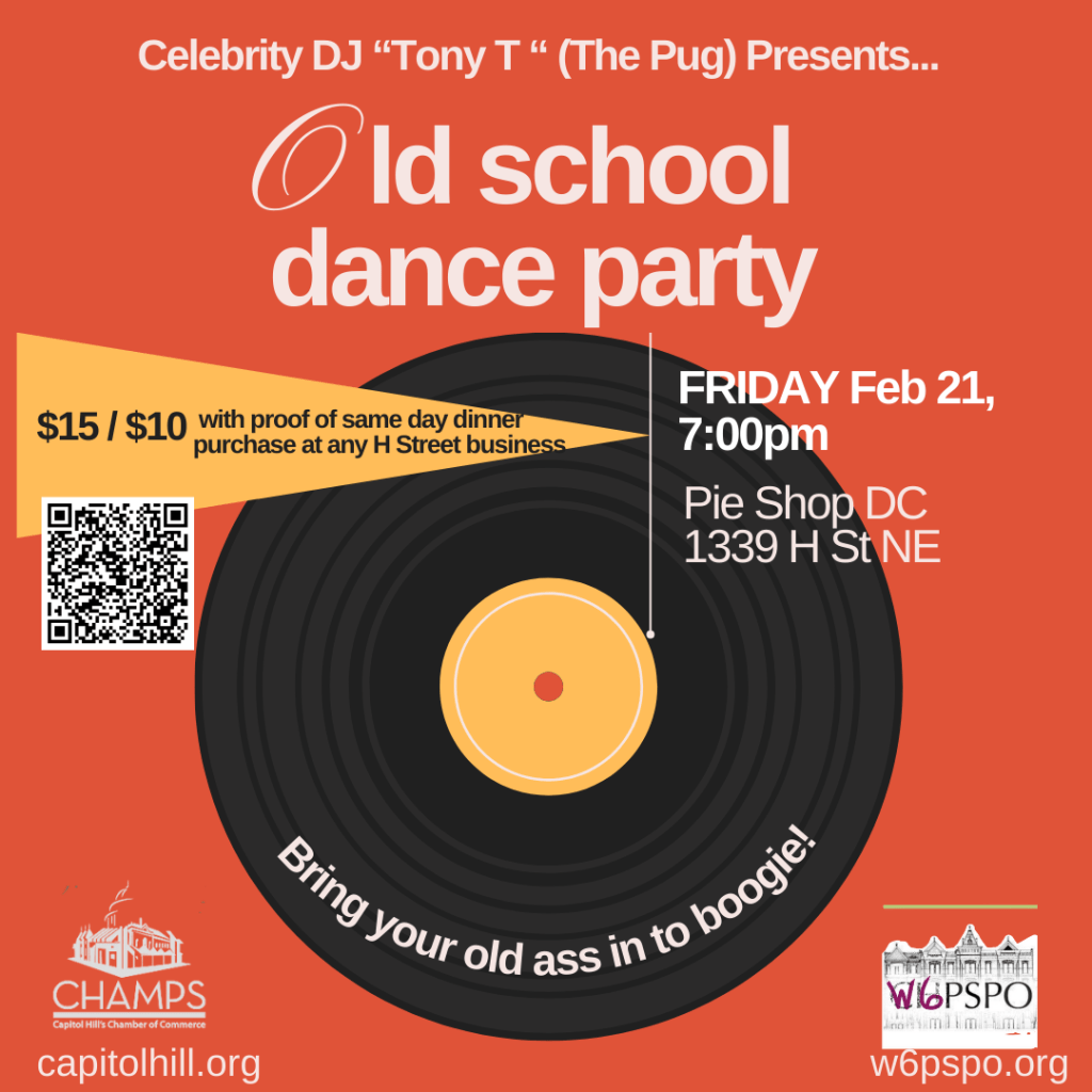 Capitol Hill’s Chamber of Commerce and W6PSPO invite you to an old school dance party on Friday, February 21 @ 7:00 p.m. at the The Pie Shop DC (1339 H St NE). Grab some friends and dance to all your favorites!