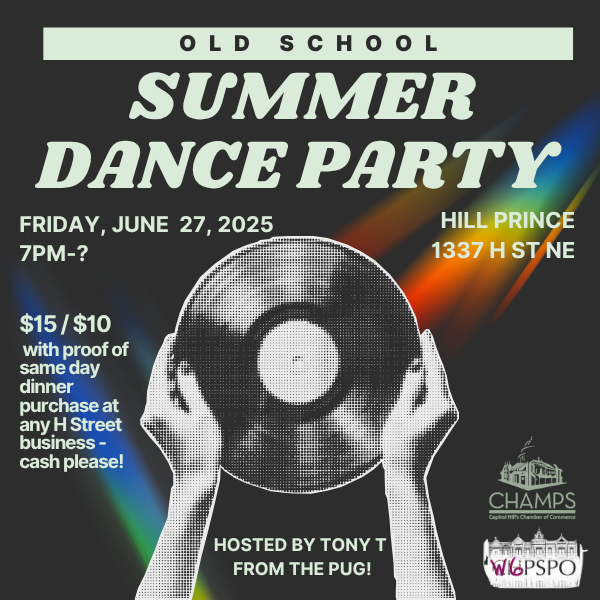 Capitol Hill’s Chamber of Commerce and W6PSPO invite you to an old school dance party on Friday, February 21 @ 7:00 p.m. at the Hill Prince (1337 H St NE). Grab some friends and dance to all your favorites!